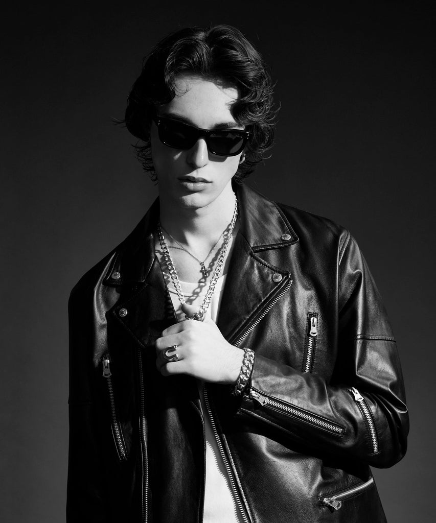 ブランドのアイコン的存在であるSPANISH LAMB LEATHER W BIKER JACKETを主役に据えたシンプルなコーディネート。インナーに白Tシャツを取り入れて、重くなりがちな印象に抜け感をプラス。