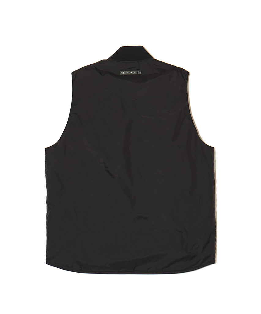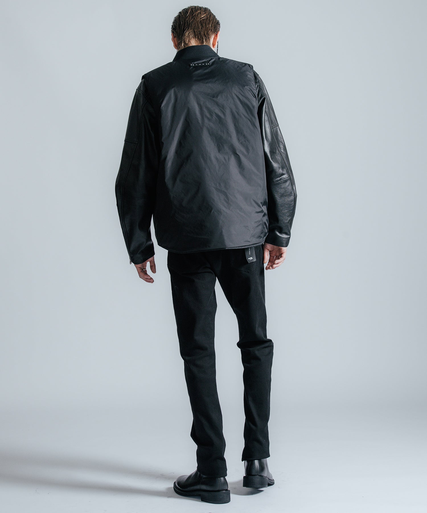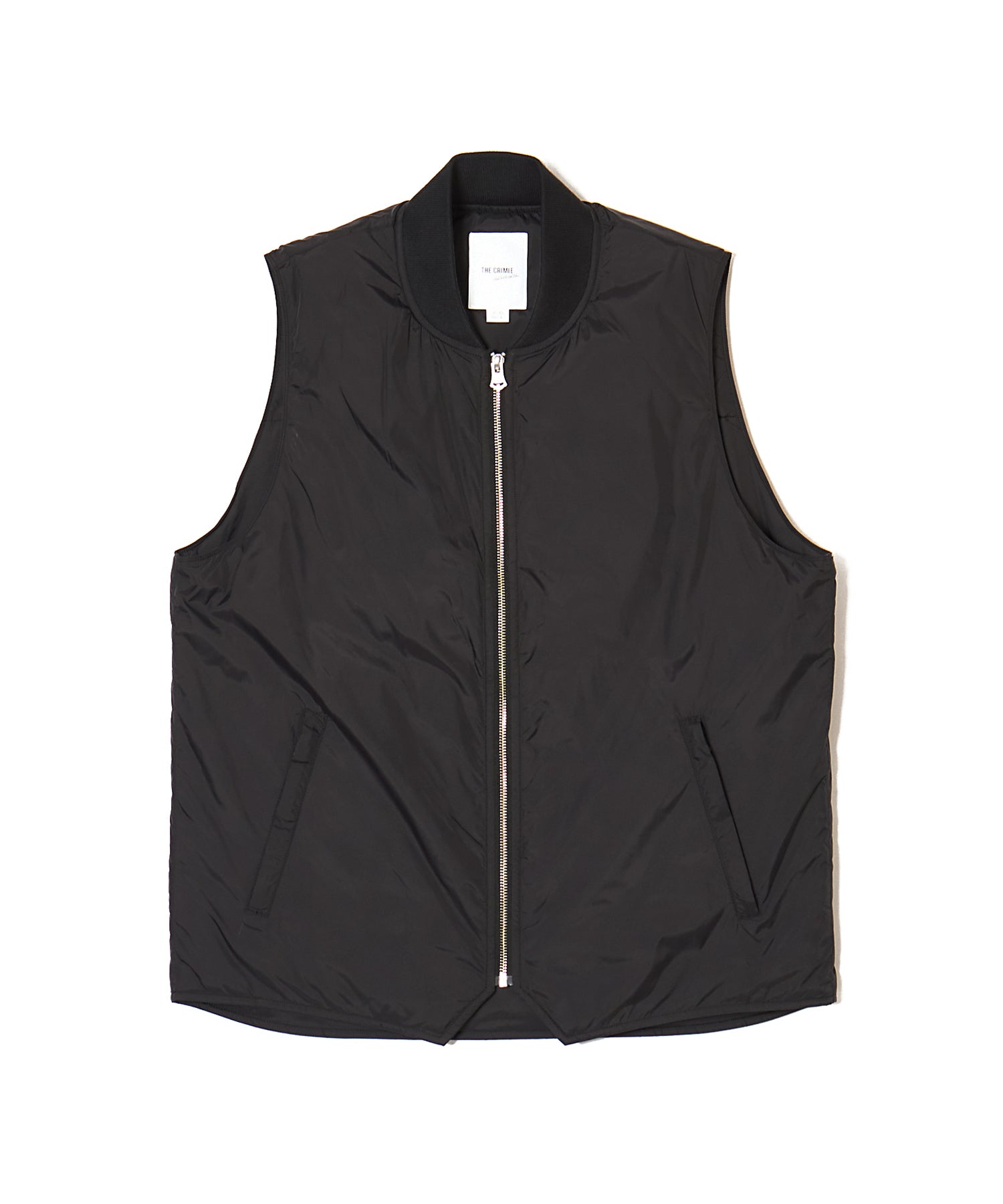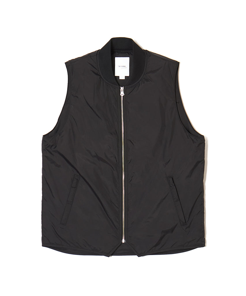光沢を抑えたマットなナイロン素材を使用し、 シンプルな中にモード感を秘めたナイロンベストです。 軽やかで、無駄のないシルエットが都会的なスタイルにすっと馴染みます。 中綿には、保温性の高い高機能素材シンサレートを採用。 驚くほど軽く、かつ高い保温性を備えているため、アウターとしてもインナーとしても使いやすいバランスに仕上がっています。 TシャツやロンT、スウェットに重ねる春秋のレイヤードはもちろん、 冬にはアウターの中に仕込むことでスタイルの幅を広げてくれる、飽きのこない“仕立てのいい万能ピース”です。 ボタンやジップヘッドには、THE CRIMIEオリジナルのパーツを使用。 背面の首元には、ブランド哲学を体現するレザー製ダイアログロゴワッペンをリベットで配置しています。 軽さと機能を追求しながら、見た目の上品さも忘れない。 スタイルに奥行きを与える、静かな一手です。