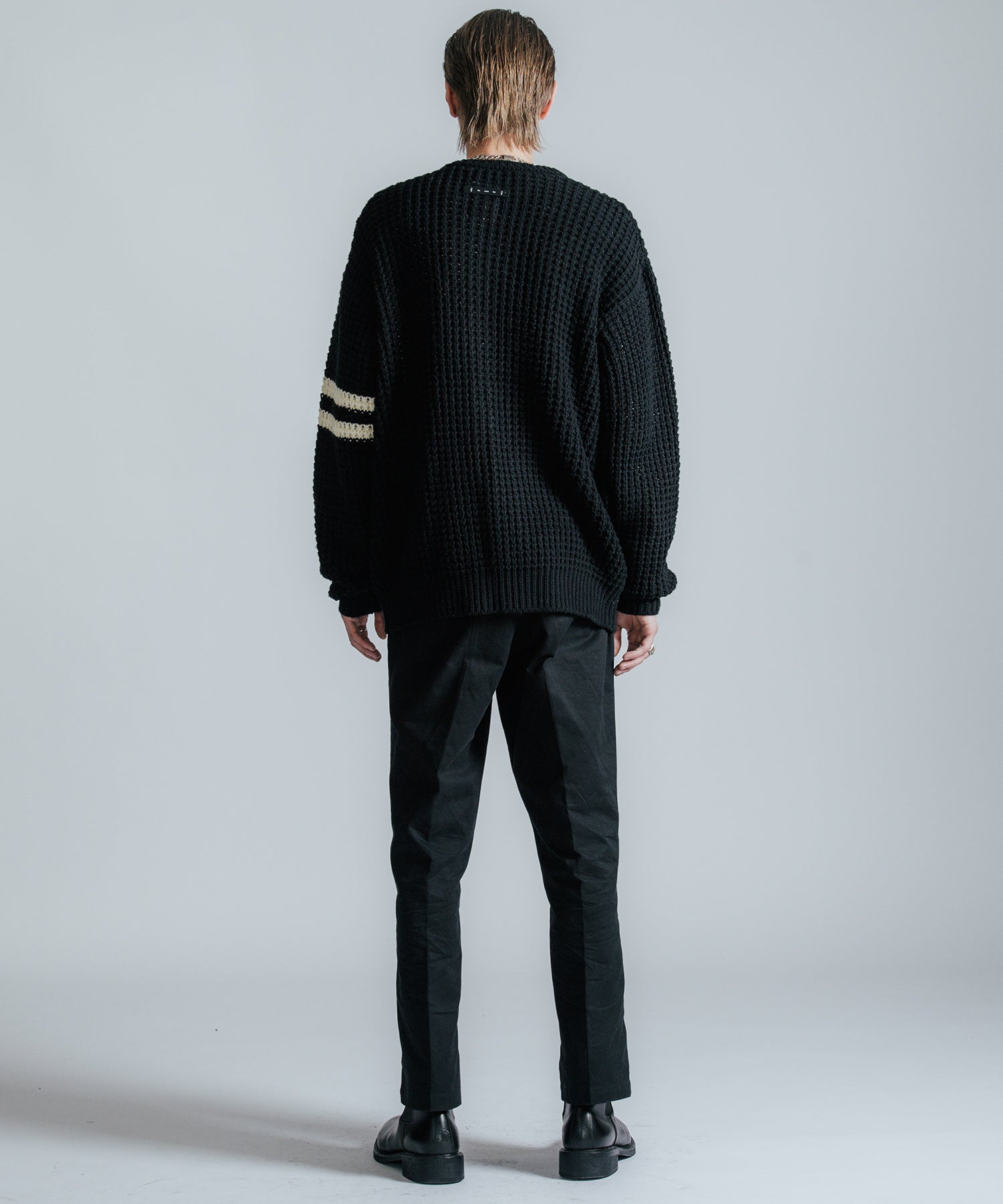 "重厚感の中に、軽やかさを宿す。" ローゲージの大きめワッフル編みで仕上げた、ボタン仕様のクルーネックカーディガン。 カウチンセーターのようなクラシックな外観を持ちながらも、驚くほど軽やかな着心地が魅力です。 ナイロンを織り交ぜることで、“軽さ”と“しなやかさ”を実現し、重く感じないのにボリューム感をしっかりと感じさせます。 クルーネックタイプでノボタンどめのデザインは、シンプルながらも存在感があり、サラリと羽織るだけでスタイルが決まるカーディガンです。 左袖にデザインされた2本のボーダーが、シンプルな中にアクセントを加え、視覚的にリズム感を生むディテールとして効いています。 腰にはダブルパッチポケットを配し、実用性も兼ね備えたデザイン。 さらに、左のパッチポケットに施されたレザー製のダイアログロゴワッペンが、ブランドの美学をさりげなく刻んでいます。 背面の首元にもレザー製のダイアログロゴワッペンを配置。 ディテールにこだわりつつも無駄のない、洗練された一着が、上質でありながらもカジュアルなスタイリングにぴったりです。 重厚感のある編み地と、驚くほど軽い着心地。 ボーダー、ポケット、レザーのディテールが絶妙に調和した、進化したカーディガン。 このアイテムが、あなたのスタイルに新たな奥行きを加えます。