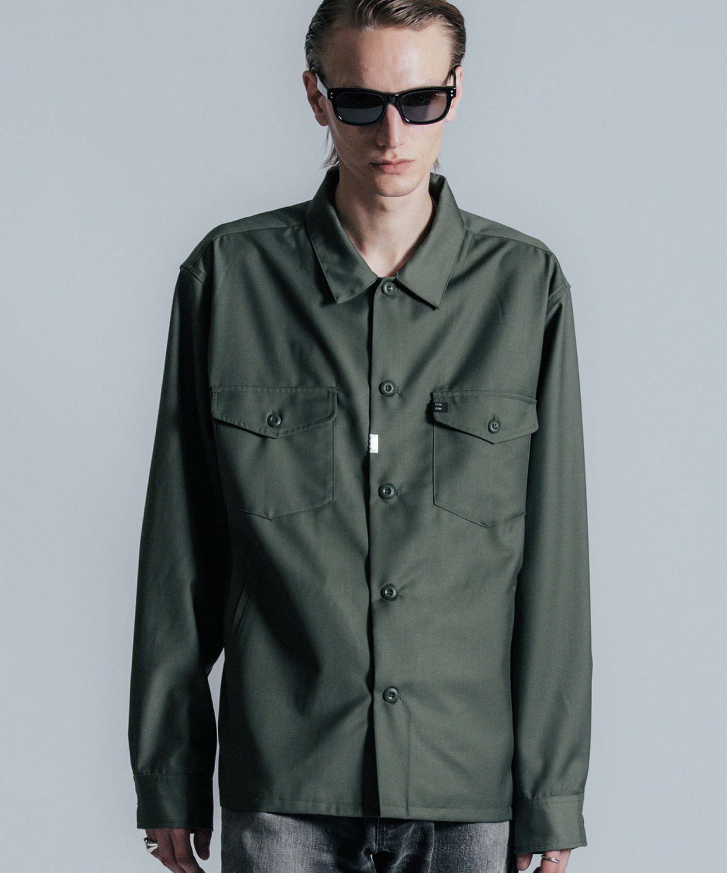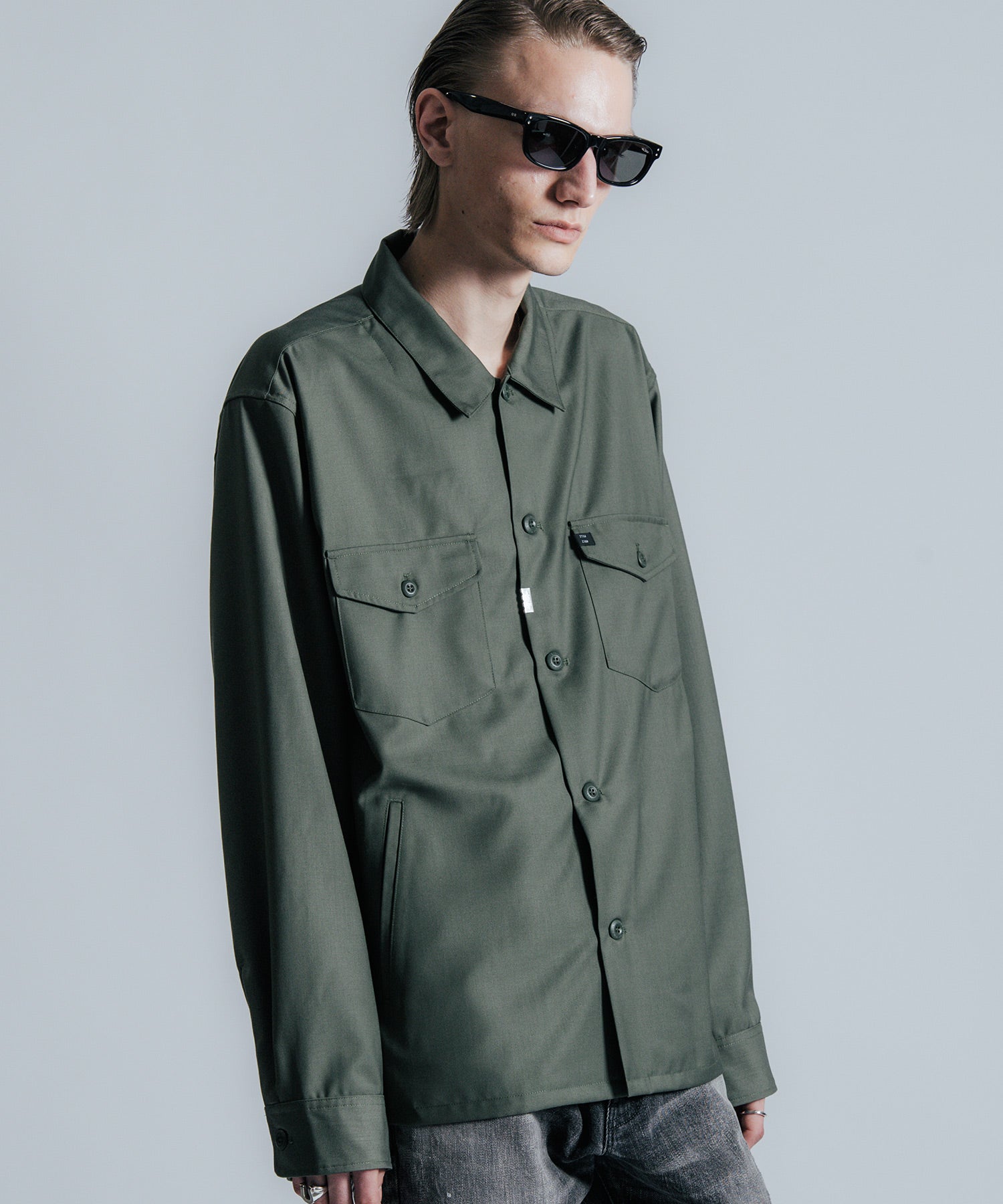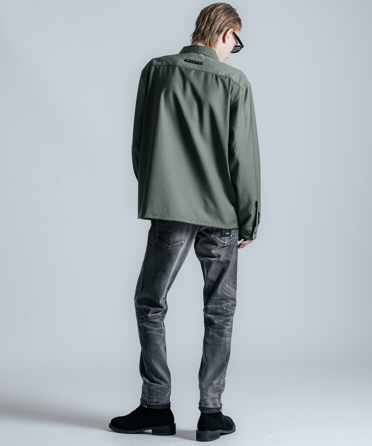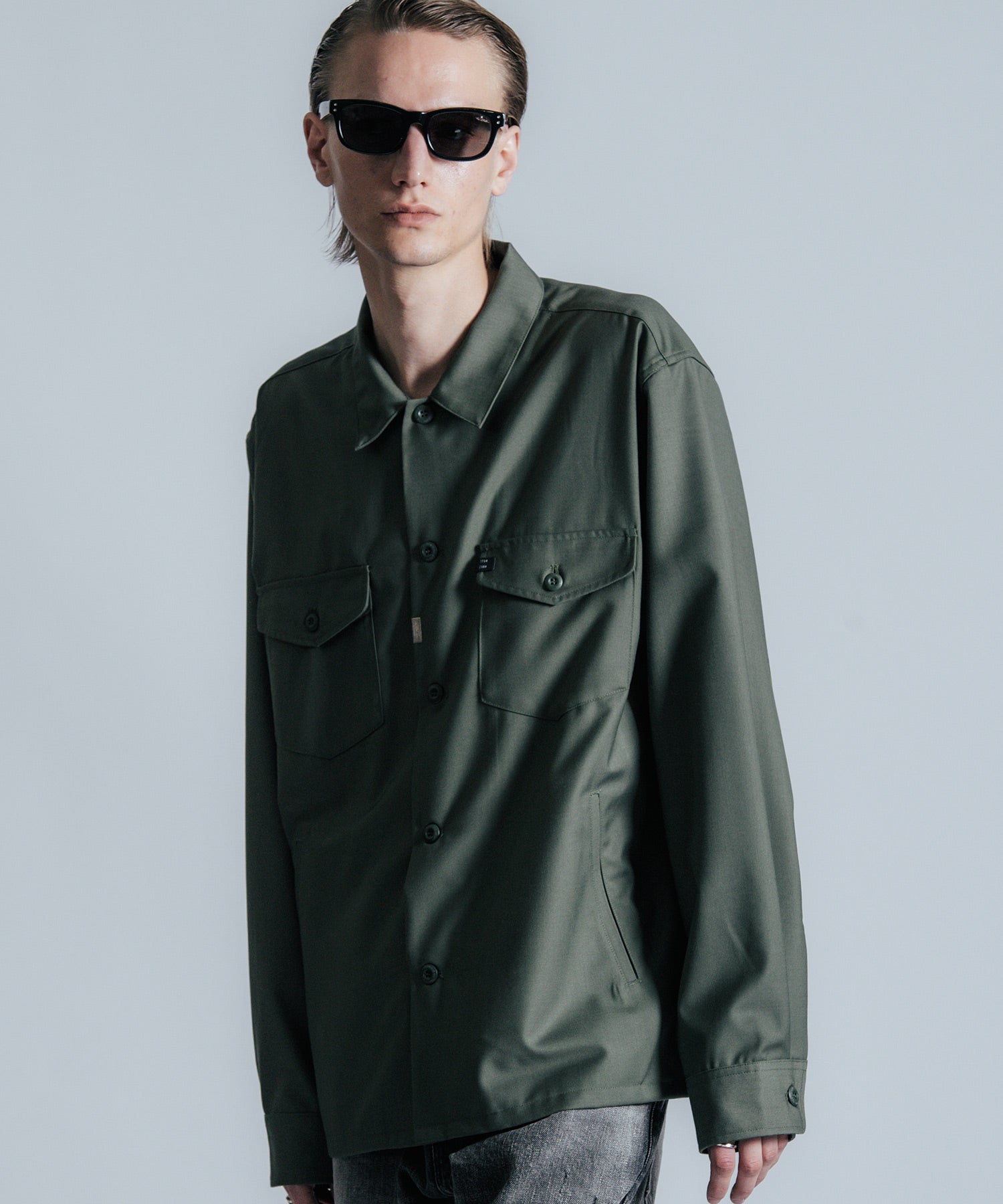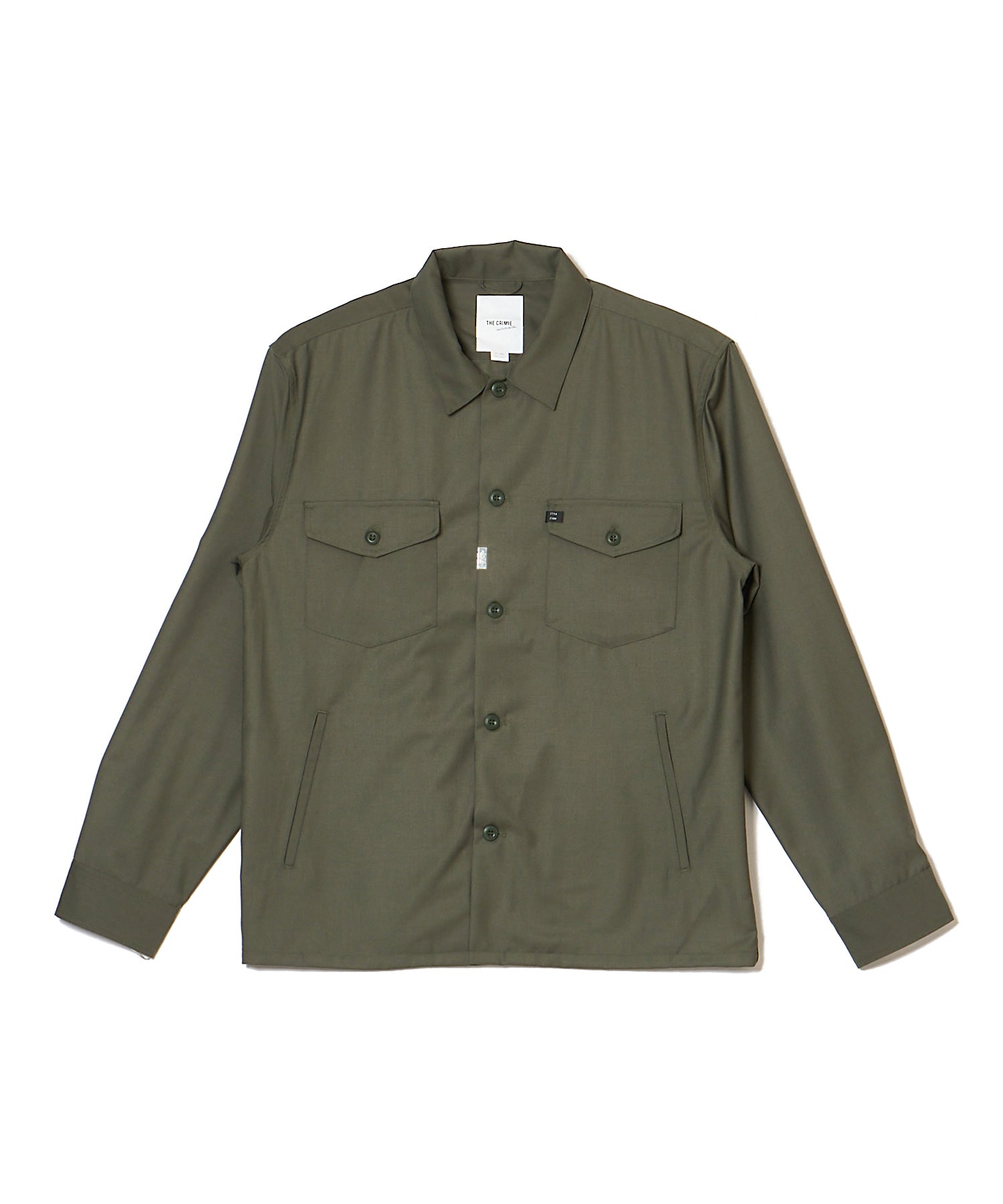 ミリタリー由来の構造と、柔らかな素材感。 そのギャップにこそ、THE CRIMIEらしい美学が宿るミリタリーシャツです。 素材には、レーヨン混の軽やかで柔らかな生地を使用。 オールシーズン対応で、羽織っても、レイヤードしても心地よい滑らかな着用感を実現しています。 胸元にはダブルフラップポケット、腰にはスラッシュポケットを配置し、 アウターライクな収納力を備えつつ、シルエットはあくまで洗練されたスマートな印象に仕上げました。 前立てにはTHE CRIMIEオリジナルのメタルクリップを使用。 ミリタリーの機能美を都会的なアクセントとして落とし込んでいます。 胸ポケットのフラップと背面の首元には、 レザー製のダイアログロゴワッペンをそれぞれ配置。 ブランドの哲学を、声高ではなく、静かに語るディテールです。 刻印入りのオリジナルボタンなど細部にもクラフトマンシップが光り、 シャツとしてはもちろん、ライトアウターとしても活躍する汎用性の高い一着です。 無骨さと上品さを共存させた、“ミリタリー”のあり方。 静かな主張でスタイルに奥行きを加える、現代的なシャツです。