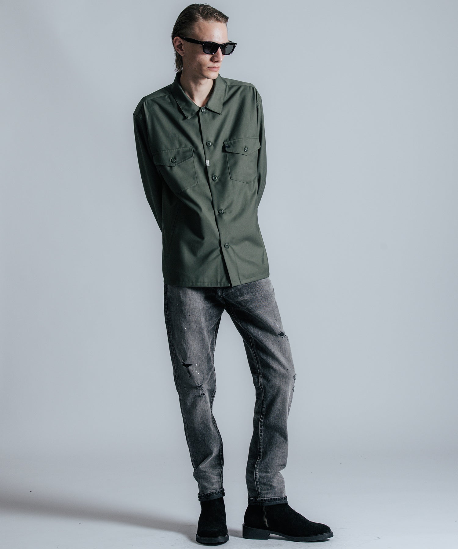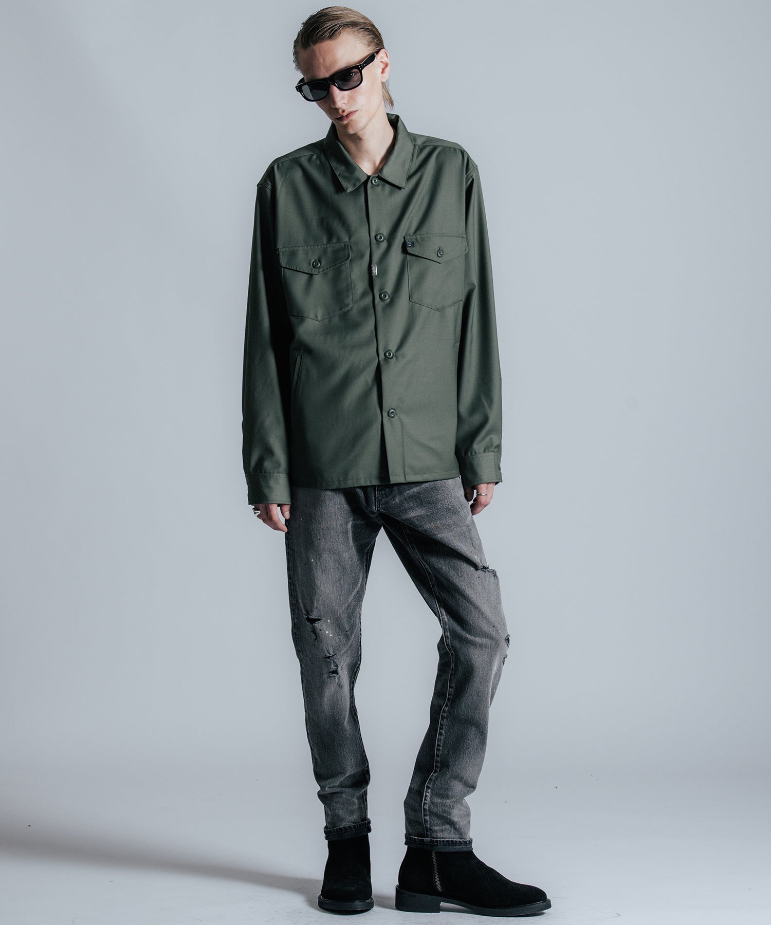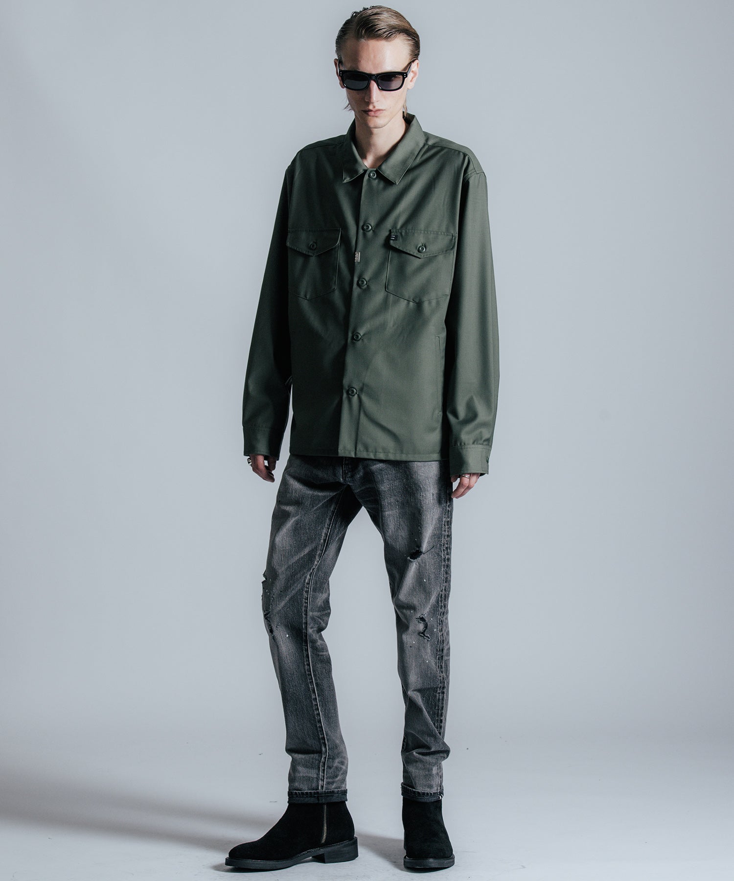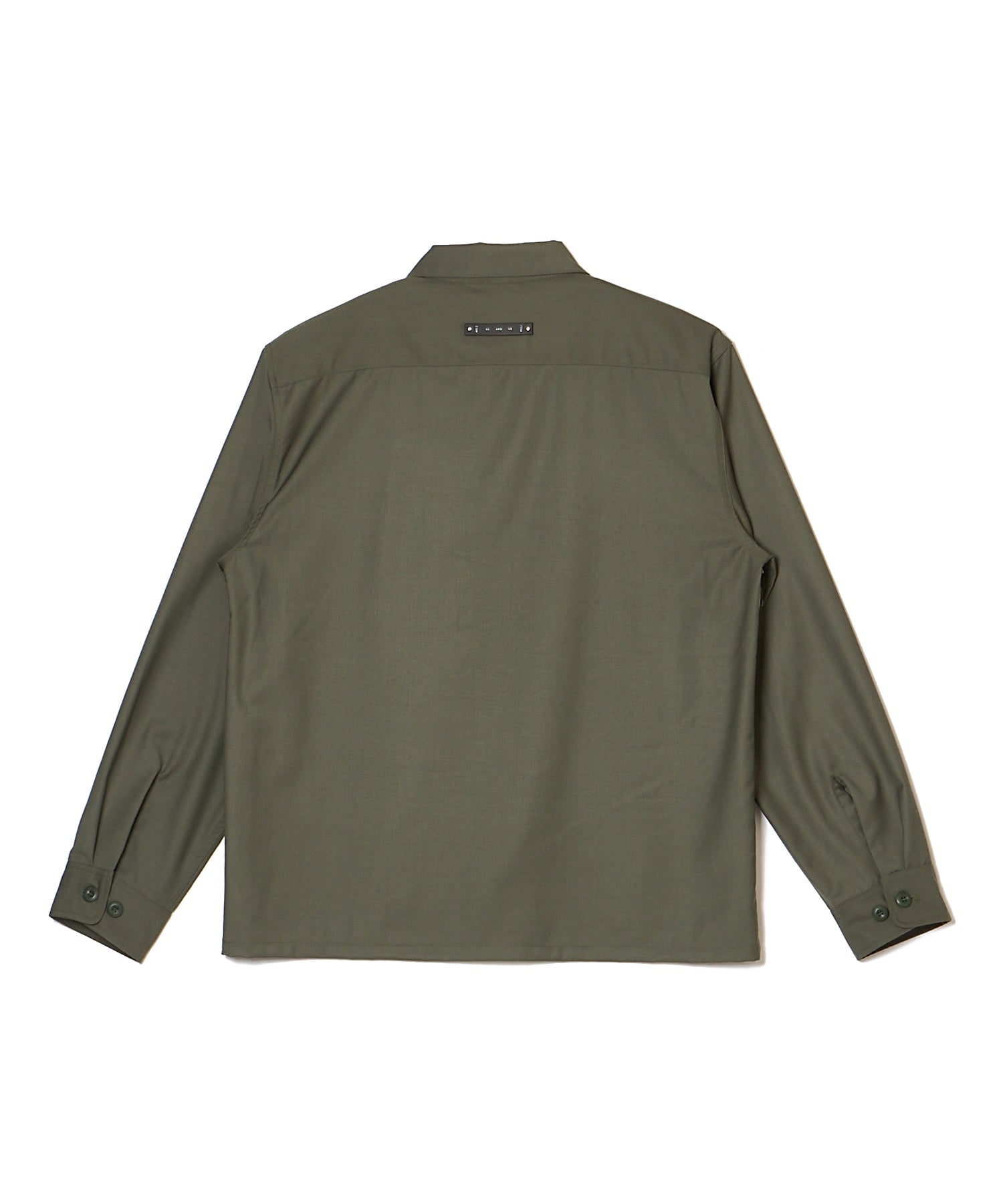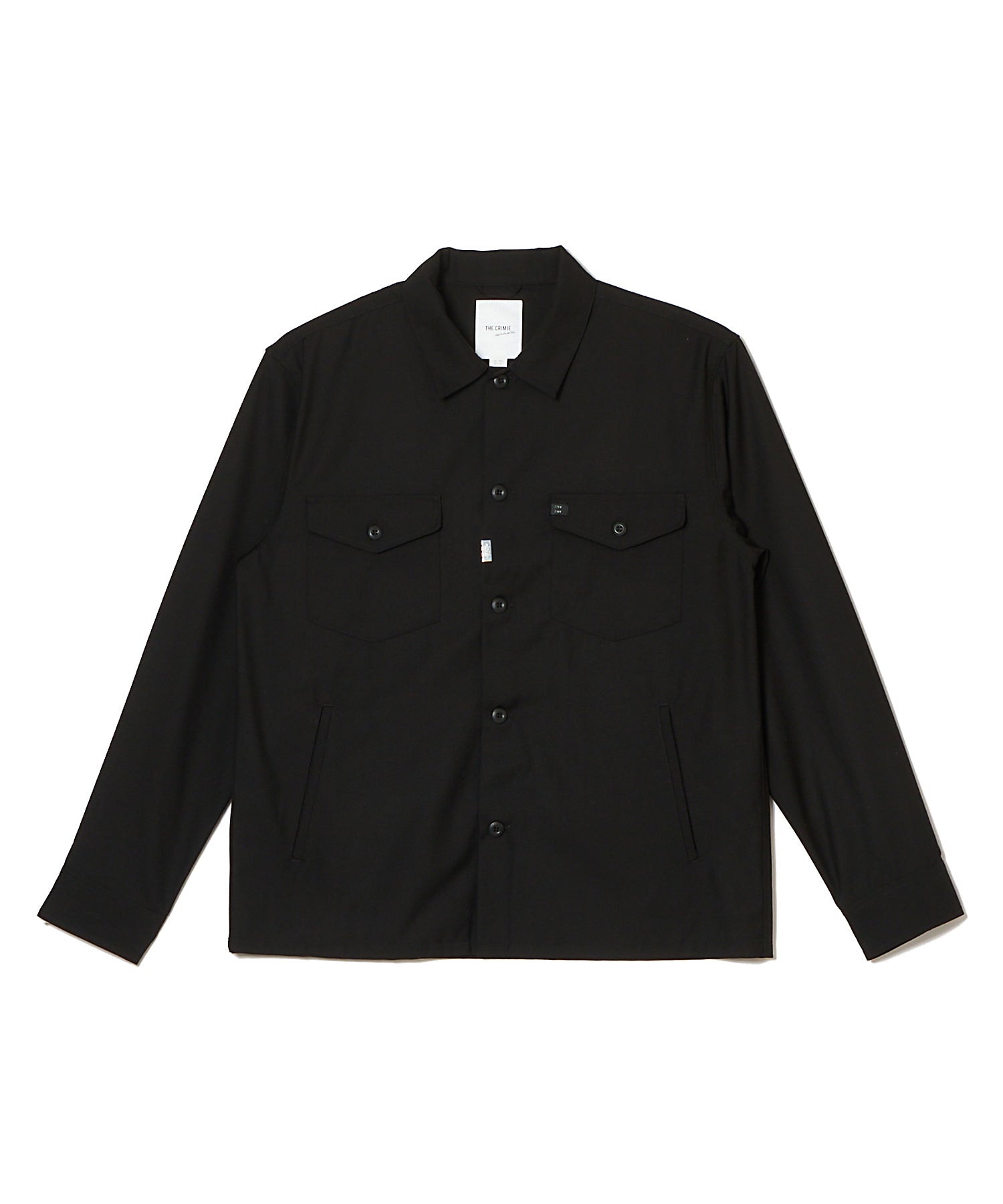 ミリタリー由来の構造と、柔らかな素材感。 そのギャップにこそ、THE CRIMIEらしい美学が宿るミリタリーシャツです。 素材には、レーヨン混の軽やかで柔らかな生地を使用。 オールシーズン対応で、羽織っても、レイヤードしても心地よい滑らかな着用感を実現しています。 胸元にはダブルフラップポケット、腰にはスラッシュポケットを配置し、 アウターライクな収納力を備えつつ、シルエットはあくまで洗練されたスマートな印象に仕上げました。 前立てにはTHE CRIMIEオリジナルのメタルクリップを使用。 ミリタリーの機能美を都会的なアクセントとして落とし込んでいます。 胸ポケットのフラップと背面の首元には、 レザー製のダイアログロゴワッペンをそれぞれ配置。 ブランドの哲学を、声高ではなく、静かに語るディテールです。 刻印入りのオリジナルボタンなど細部にもクラフトマンシップが光り、 シャツとしてはもちろん、ライトアウターとしても活躍する汎用性の高い一着です。 無骨さと上品さを共存させた、“ミリタリー”のあり方。 静かな主張でスタイルに奥行きを加える、現代的なシャツです。