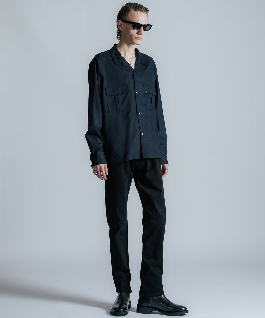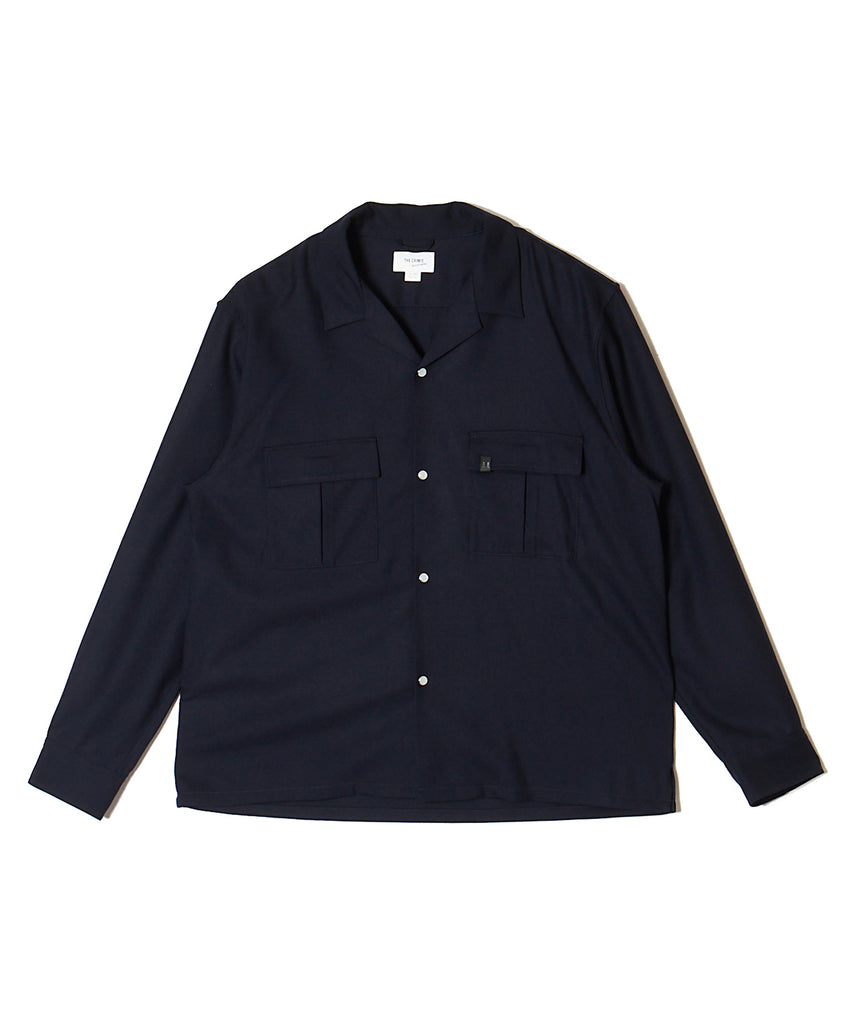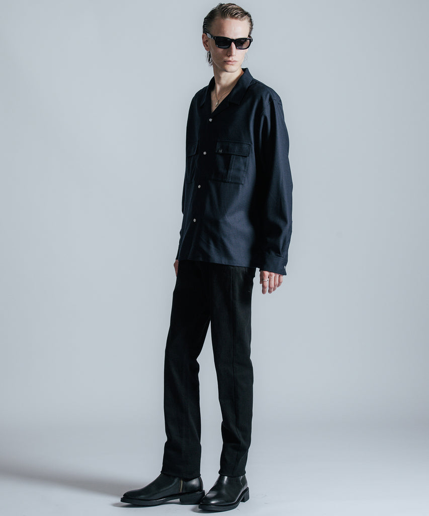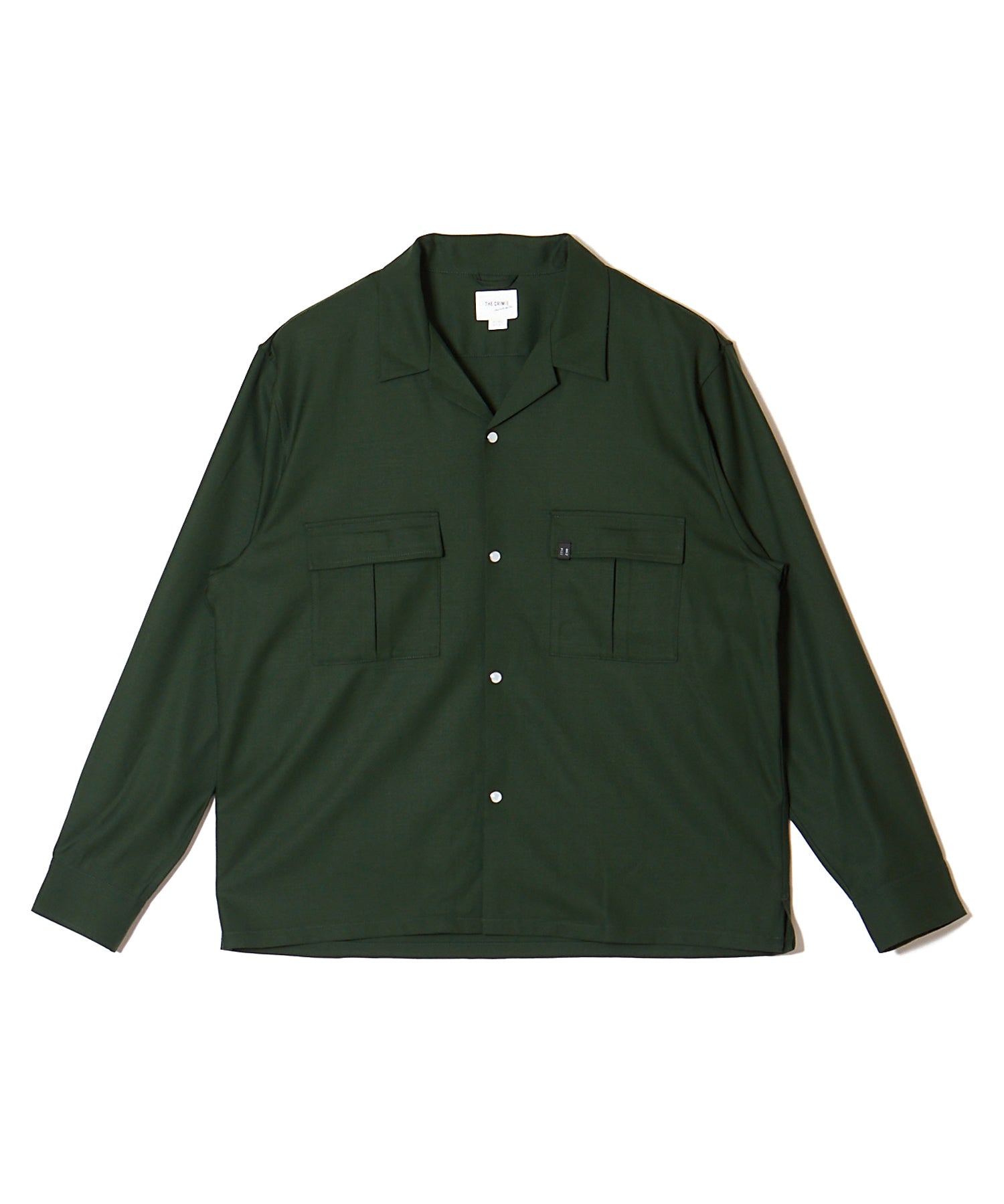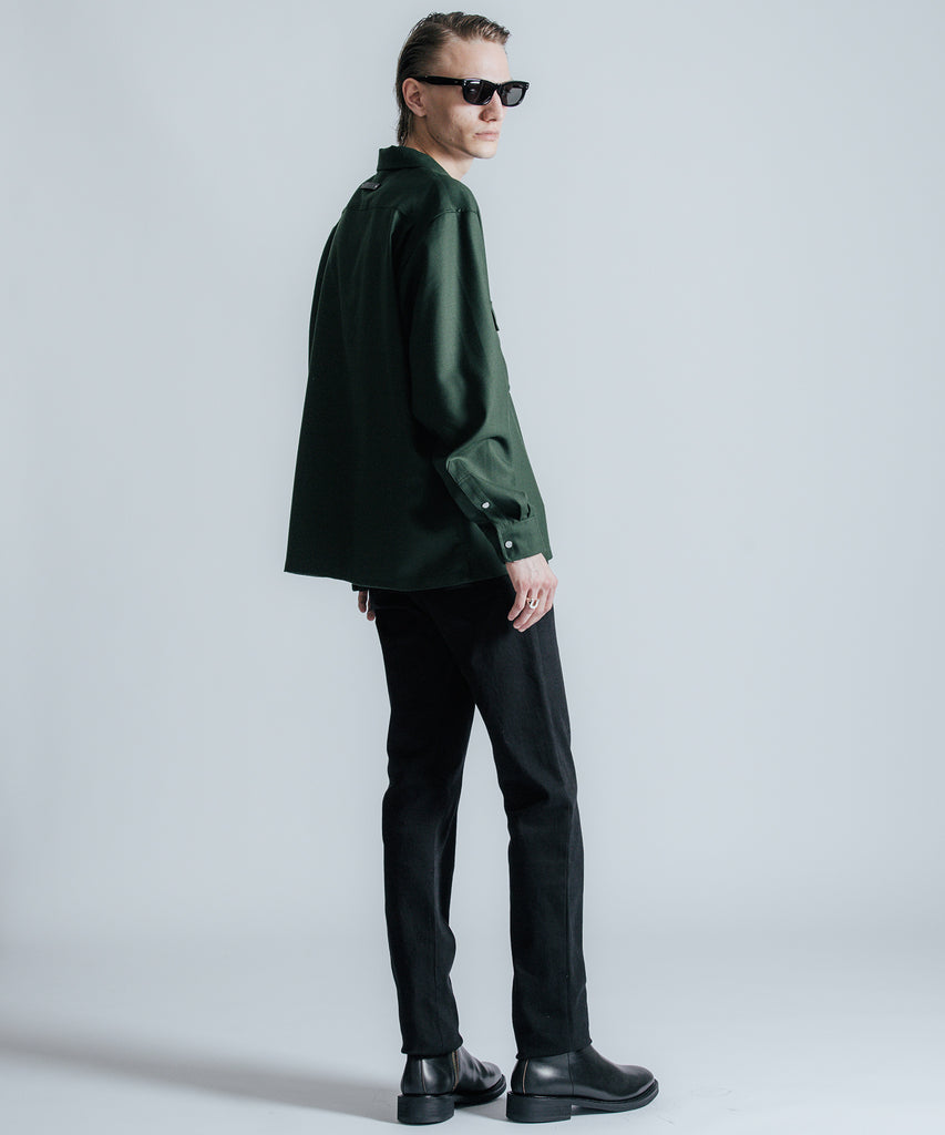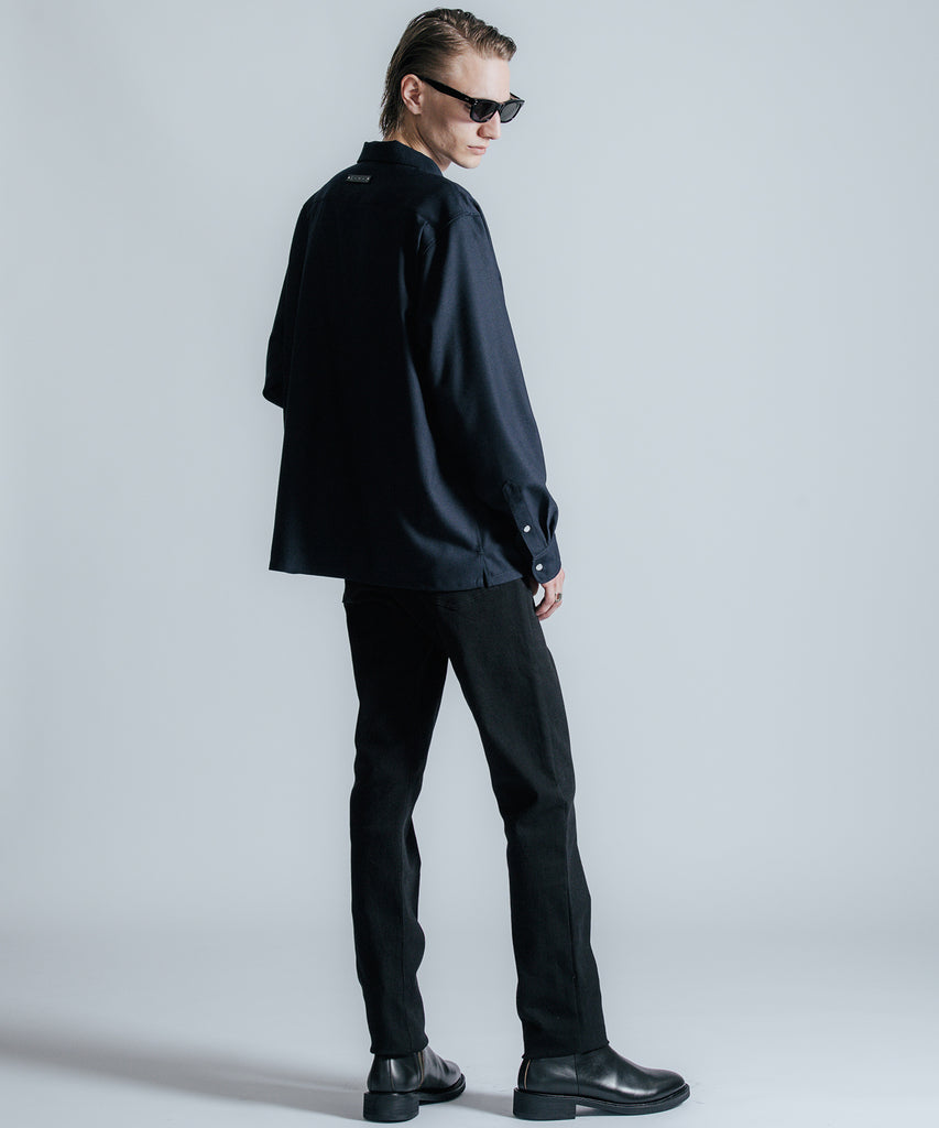 ウールの持つ上質な艶とドレープを、クラシックなシャツスタイルに落とし込んだ、THE CRIMIEのウールシャツです。 しっとりとした手触りと、ほどよい厚みがもたらす品格ある表情が、ベースにあるアメカジの空気を静かに格上げします。 生地には、上質なウール混素材を使用。 肌触りがやさしく、秋冬のレイヤードにも快適に馴染む一枚です。 デザインは、スクエア型のダブルフラップポケットを胸元に配し、フラップにはレザー製ダイアログロゴワッペンをオン。 背面首元にも同様のワッペンをあしらい、控えめながらもブランドの美学を体現しています。 ボタンには、ウエスタンシャツで見られるパールドットボタンを採用。 クラシックなディテールを取り入れながら、洗練されたシルエットと素材感で、ただのアメカジでは終わらない一着に仕上げました。 パンツを選ばず、ジャケットにもレザーにも馴染む。 大人のワードローブに“上質な差が出る余白”を加えるシャツです。