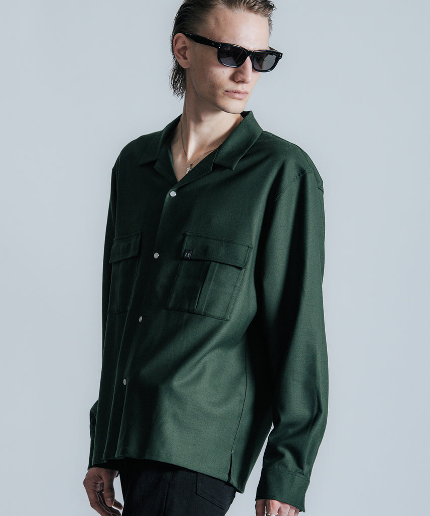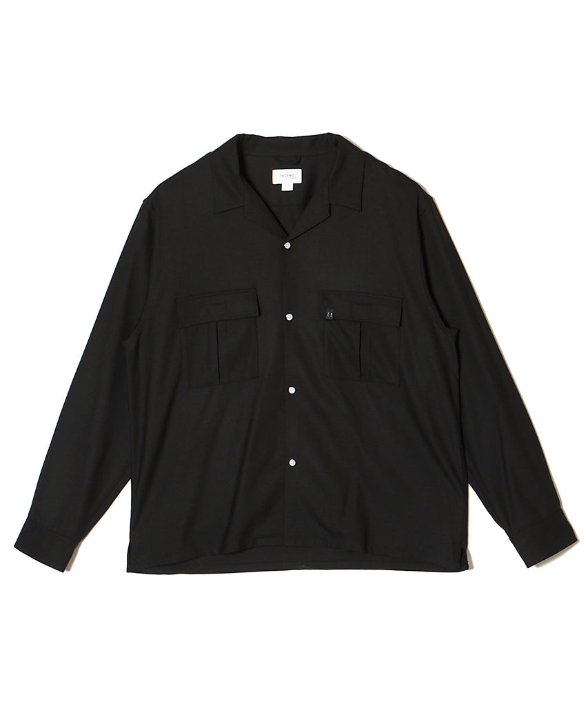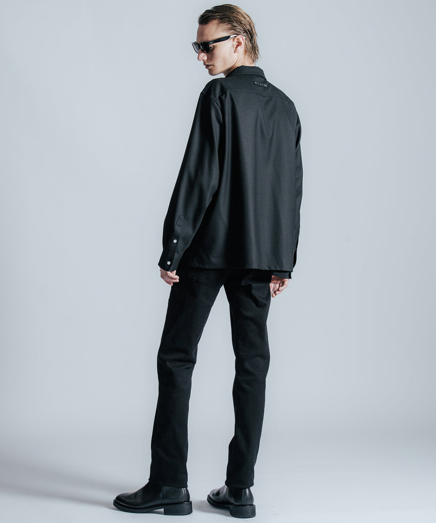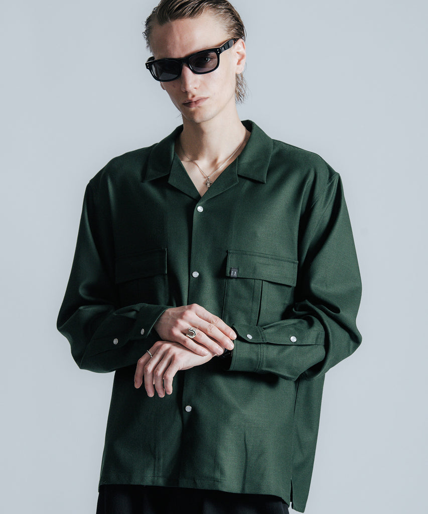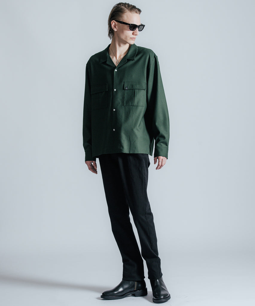 ウールの持つ上質な艶とドレープを、クラシックなシャツスタイルに落とし込んだ、THE CRIMIEのウールシャツです。 しっとりとした手触りと、ほどよい厚みがもたらす品格ある表情が、ベースにあるアメカジの空気を静かに格上げします。 生地には、上質なウール混素材を使用。 肌触りがやさしく、秋冬のレイヤードにも快適に馴染む一枚です。 デザインは、スクエア型のダブルフラップポケットを胸元に配し、フラップにはレザー製ダイアログロゴワッペンをオン。 背面首元にも同様のワッペンをあしらい、控えめながらもブランドの美学を体現しています。 ボタンには、ウエスタンシャツで見られるパールドットボタンを採用。 クラシックなディテールを取り入れながら、洗練されたシルエットと素材感で、ただのアメカジでは終わらない一着に仕上げました。 パンツを選ばず、ジャケットにもレザーにも馴染む。 大人のワードローブに“上質な差が出る余白”を加えるシャツです。