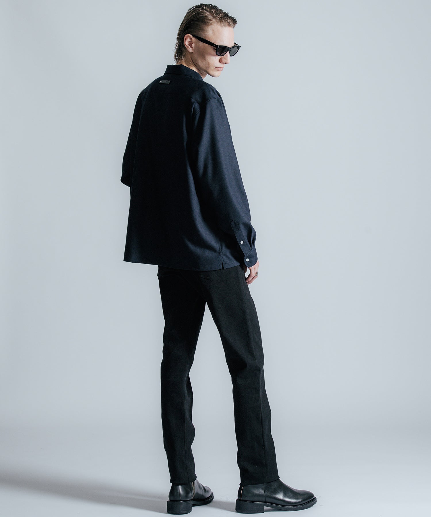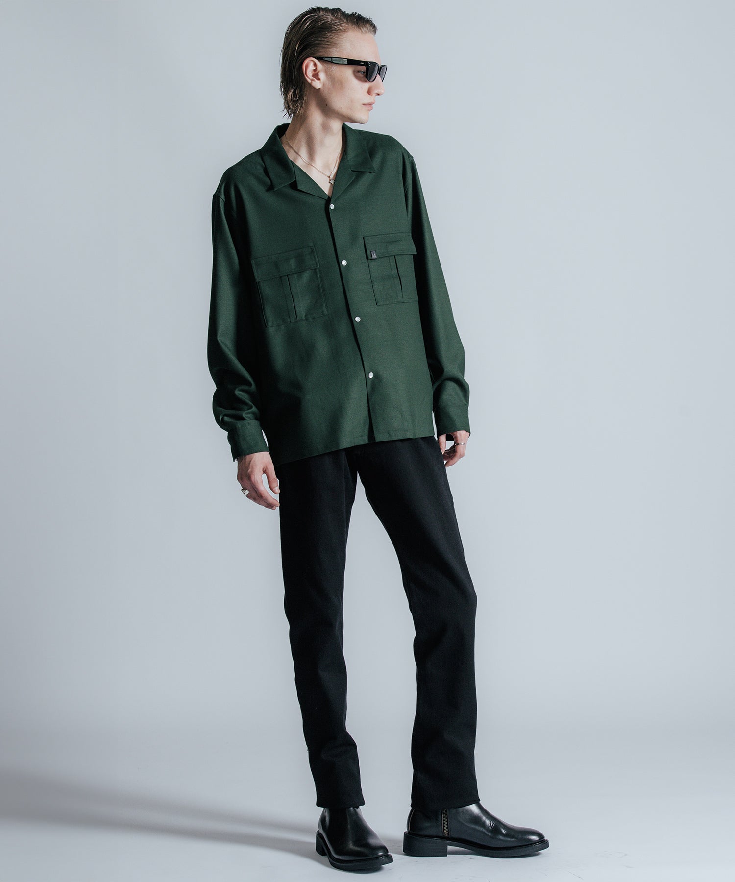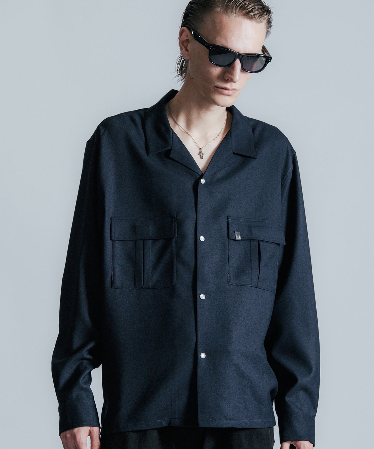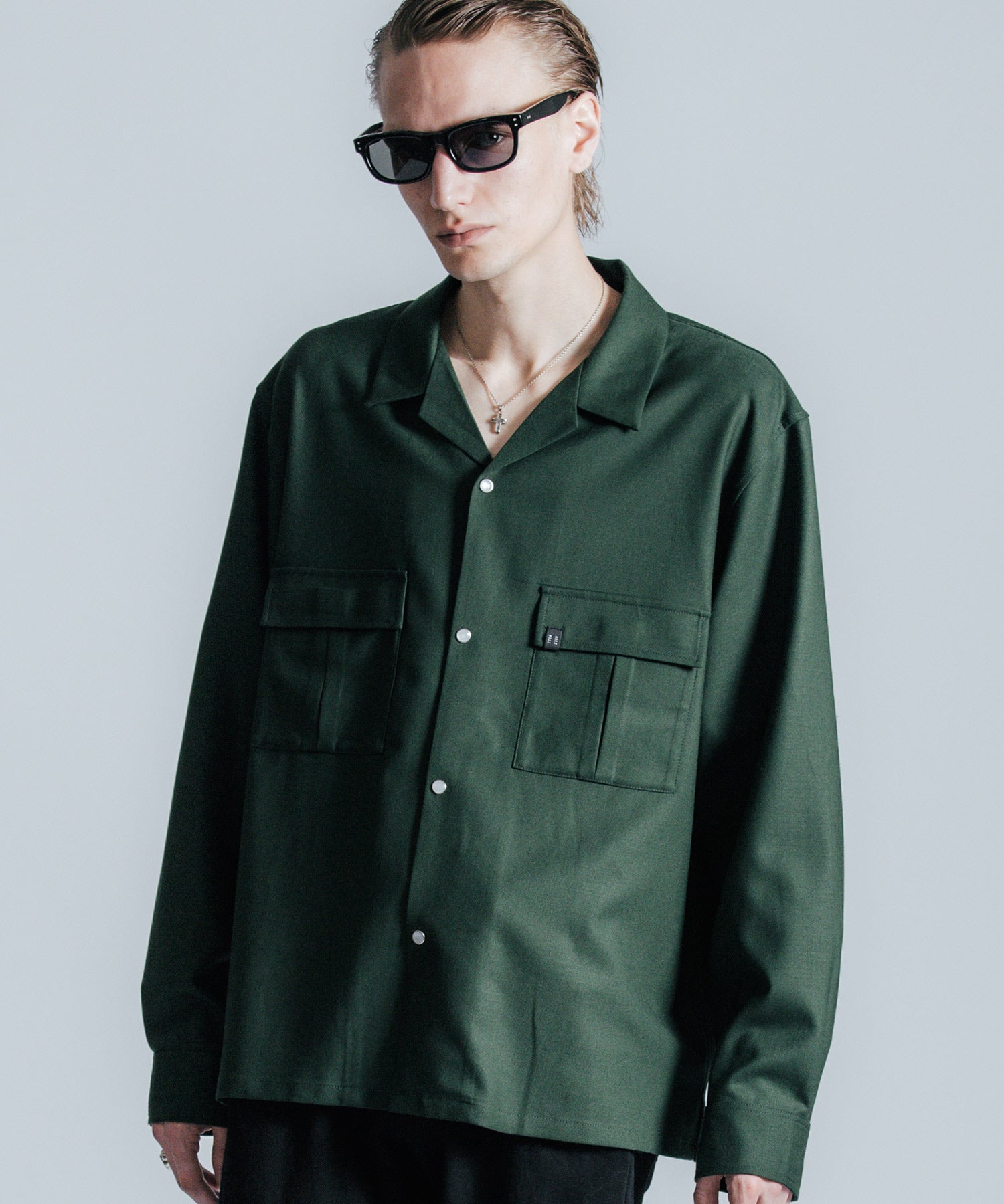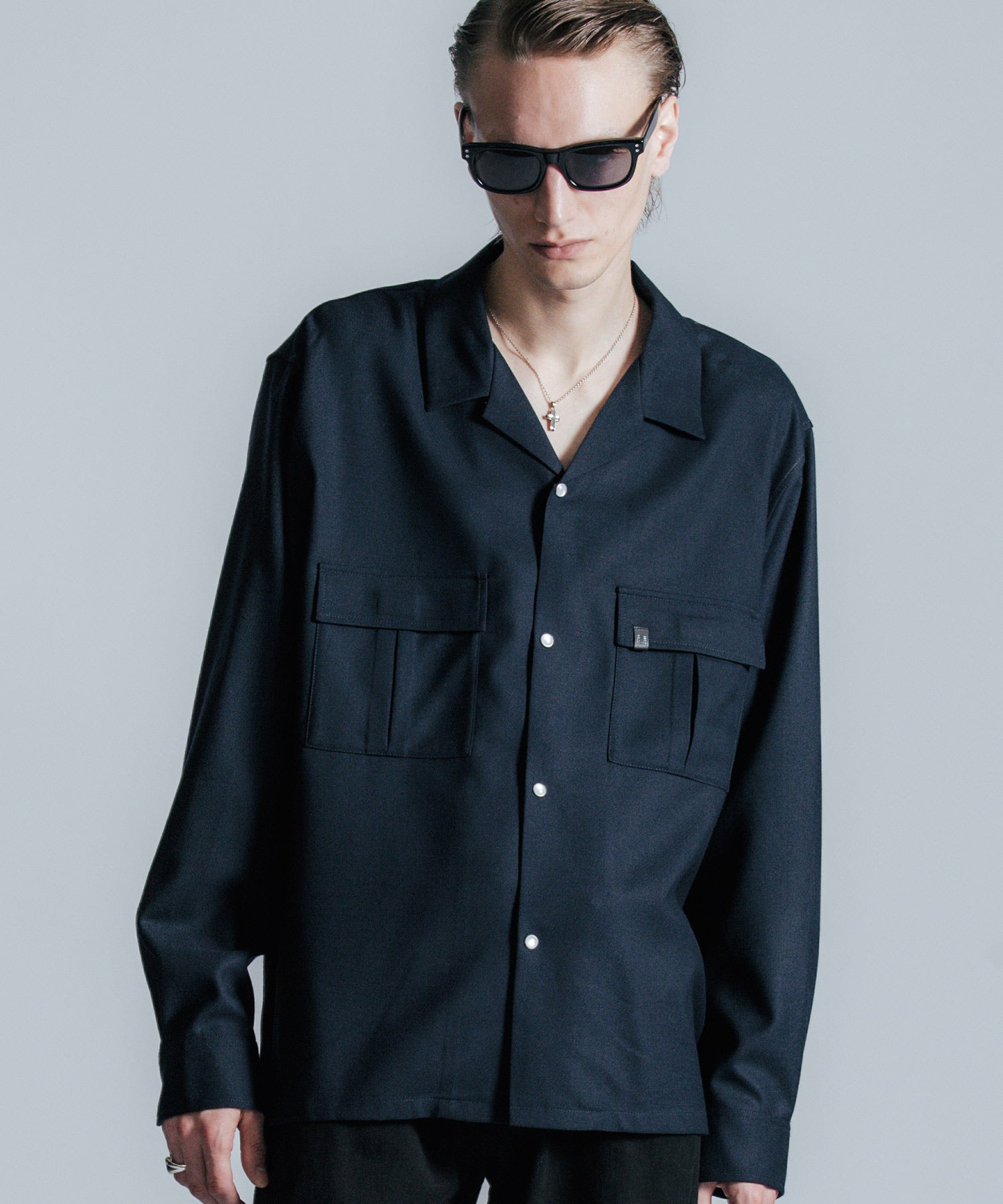 ウールの持つ上質な艶とドレープを、クラシックなシャツスタイルに落とし込んだ、THE CRIMIEのウールシャツです。 しっとりとした手触りと、ほどよい厚みがもたらす品格ある表情が、ベースにあるアメカジの空気を静かに格上げします。 生地には、上質なウール混素材を使用。 肌触りがやさしく、秋冬のレイヤードにも快適に馴染む一枚です。 デザインは、スクエア型のダブルフラップポケットを胸元に配し、フラップにはレザー製ダイアログロゴワッペンをオン。 背面首元にも同様のワッペンをあしらい、控えめながらもブランドの美学を体現しています。 ボタンには、ウエスタンシャツで見られるパールドットボタンを採用。 クラシックなディテールを取り入れながら、洗練されたシルエットと素材感で、ただのアメカジでは終わらない一着に仕上げました。 パンツを選ばず、ジャケットにもレザーにも馴染む。 大人のワードローブに“上質な差が出る余白”を加えるシャツです。