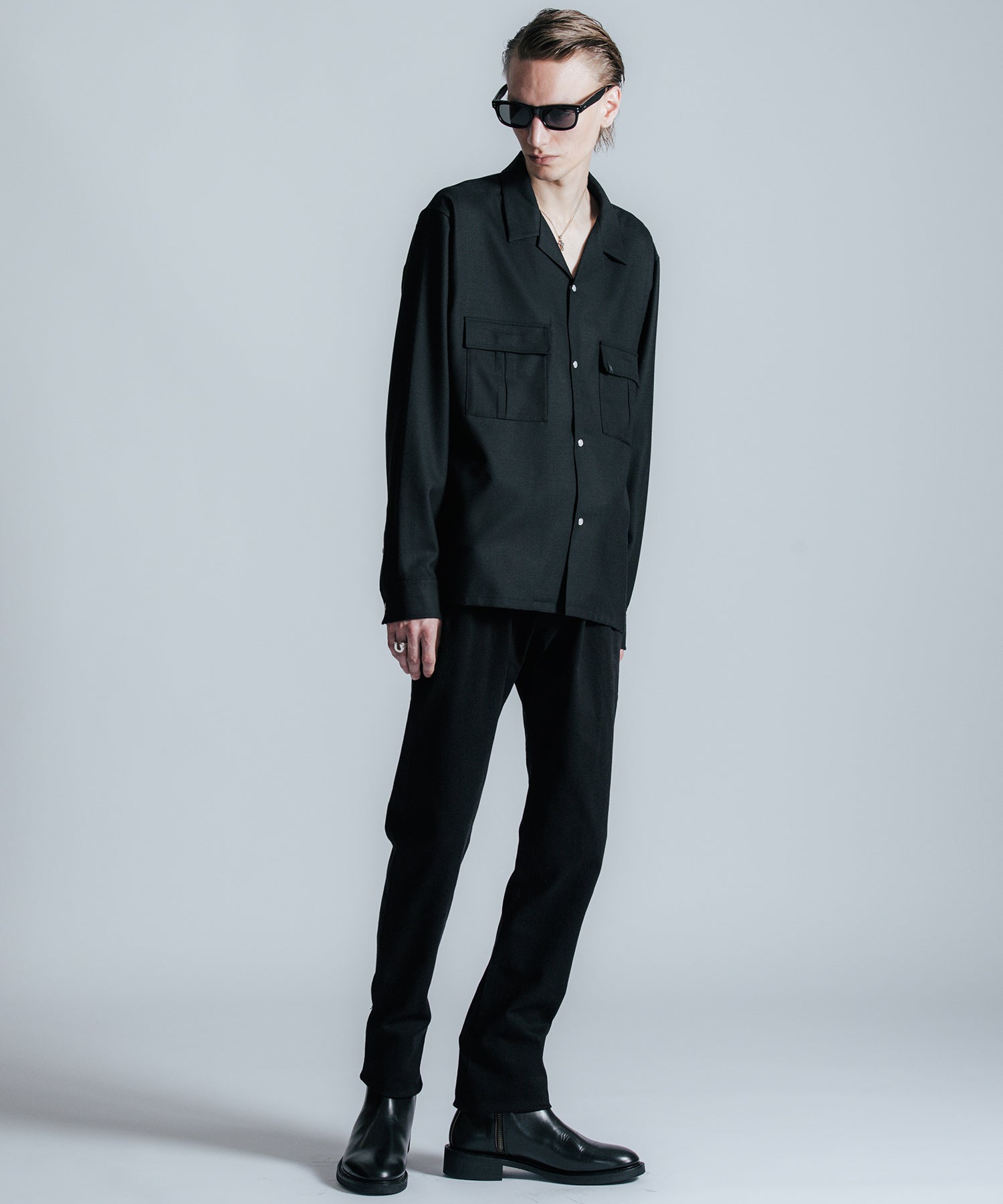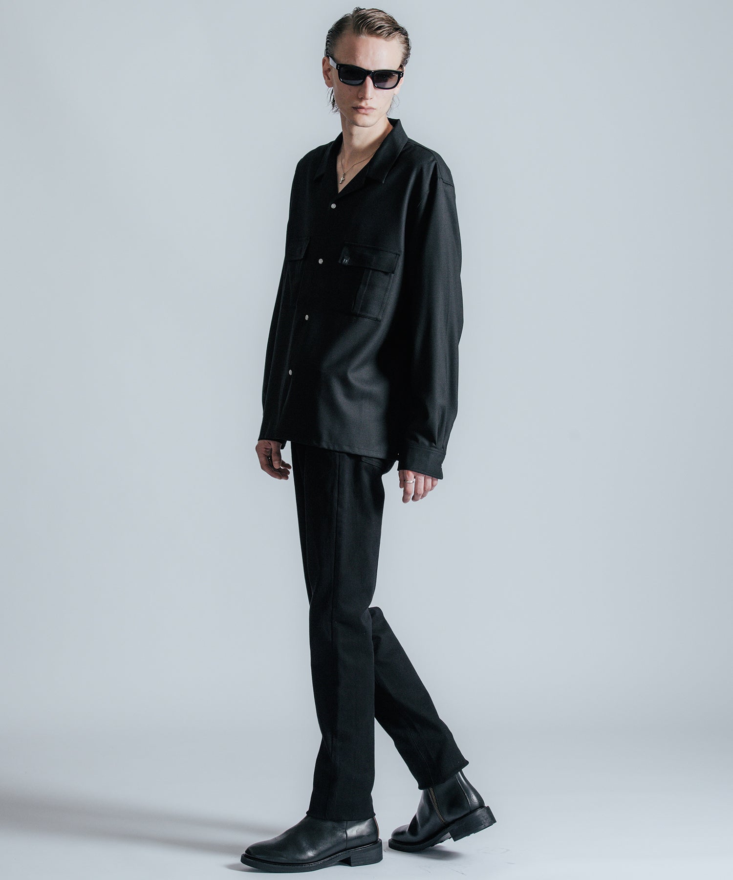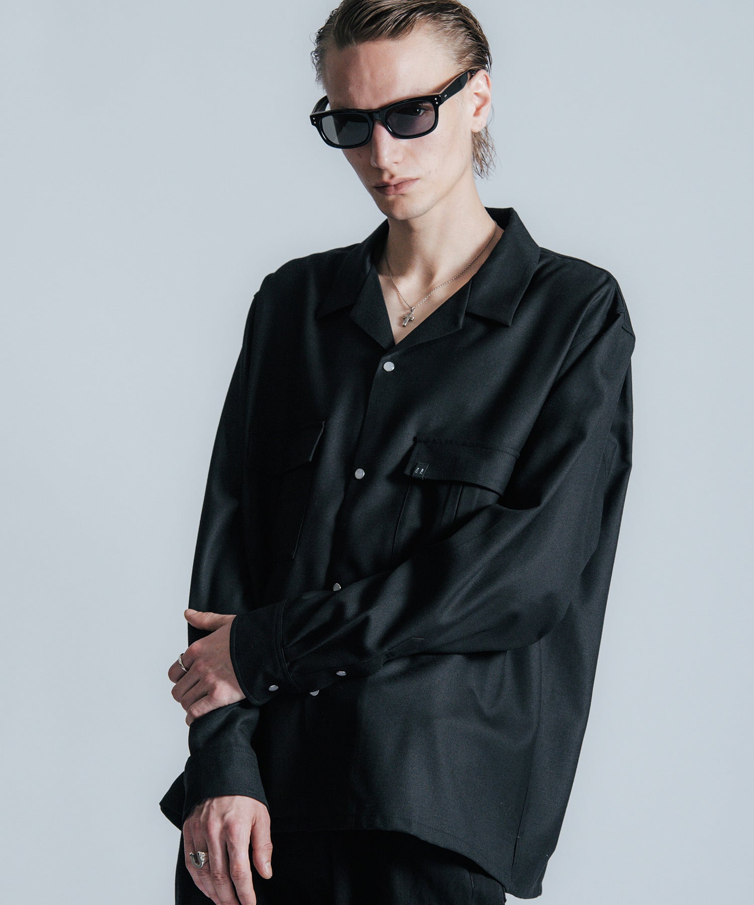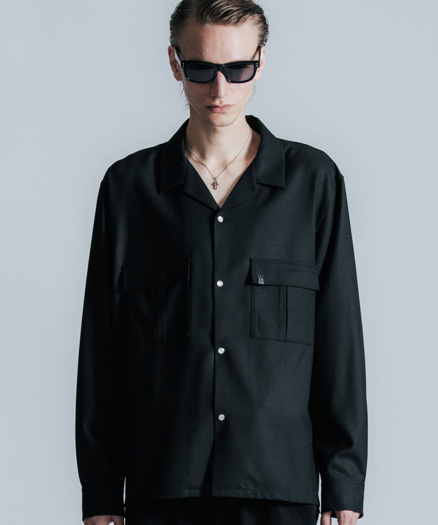 ウールの持つ上質な艶とドレープを、クラシックなシャツスタイルに落とし込んだ、THE CRIMIEのウールシャツです。 しっとりとした手触りと、ほどよい厚みがもたらす品格ある表情が、ベースにあるアメカジの空気を静かに格上げします。 生地には、上質なウール混素材を使用。 肌触りがやさしく、秋冬のレイヤードにも快適に馴染む一枚です。 デザインは、スクエア型のダブルフラップポケットを胸元に配し、フラップにはレザー製ダイアログロゴワッペンをオン。 背面首元にも同様のワッペンをあしらい、控えめながらもブランドの美学を体現しています。 ボタンには、ウエスタンシャツで見られるパールドットボタンを採用。 クラシックなディテールを取り入れながら、洗練されたシルエットと素材感で、ただのアメカジでは終わらない一着に仕上げました。 パンツを選ばず、ジャケットにもレザーにも馴染む。 大人のワードローブに“上質な差が出る余白”を加えるシャツです。