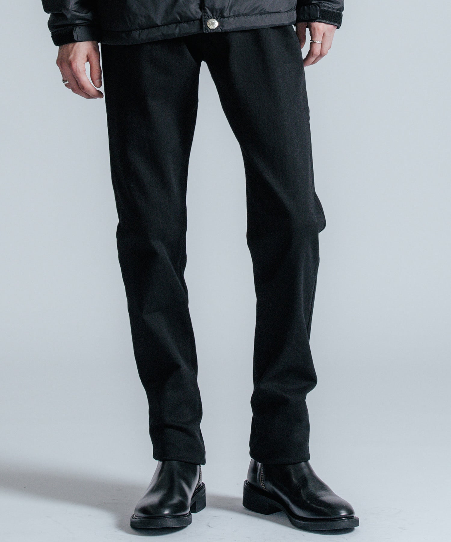 ストレッチが効いたオールシーズン着用できる生地を使ったスリムストレートタイプのシルエットデザイン。