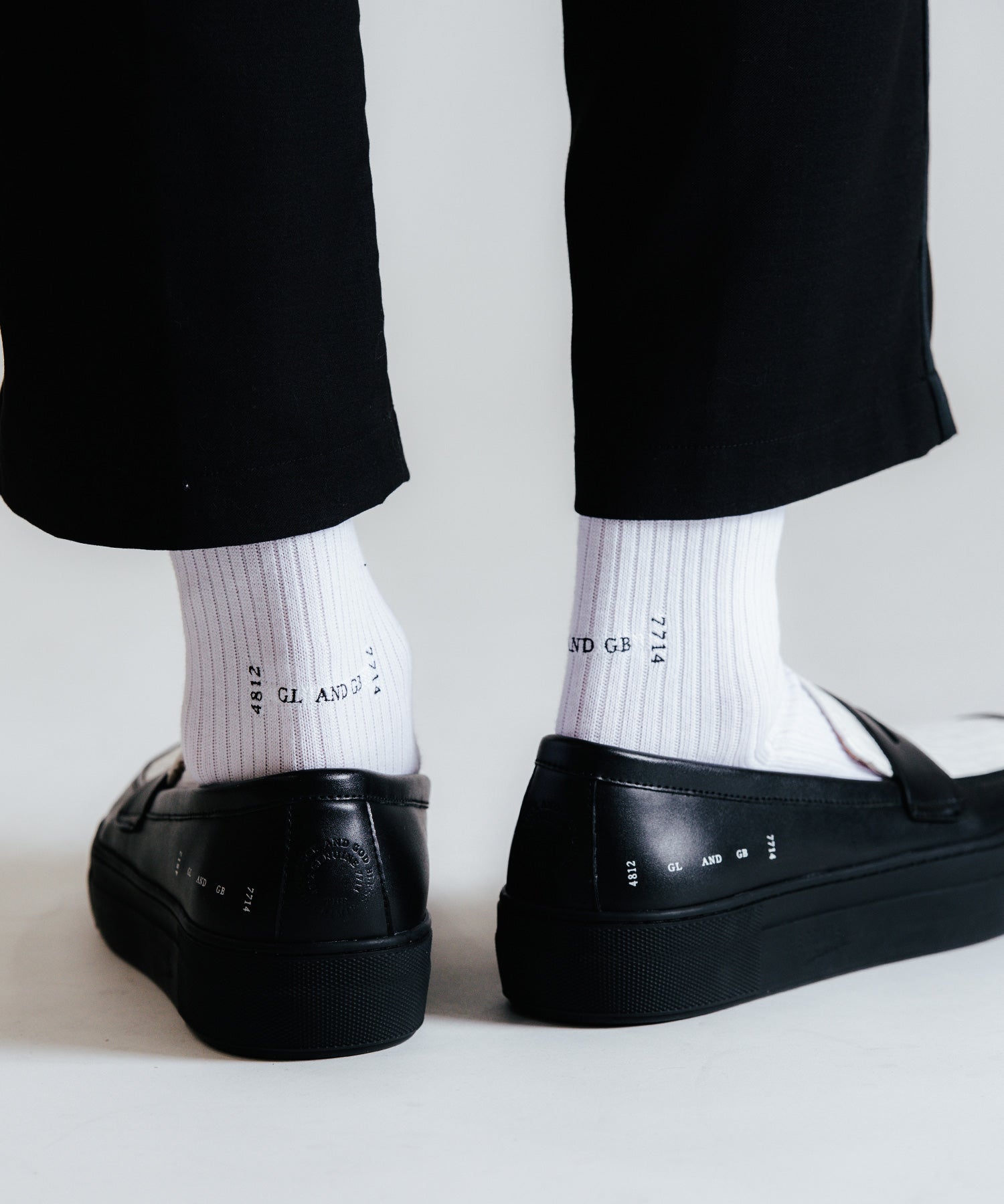 スラックスにも相性のいい、ダイアログロゴを刺繍した綺麗なリブ編みの靴下。