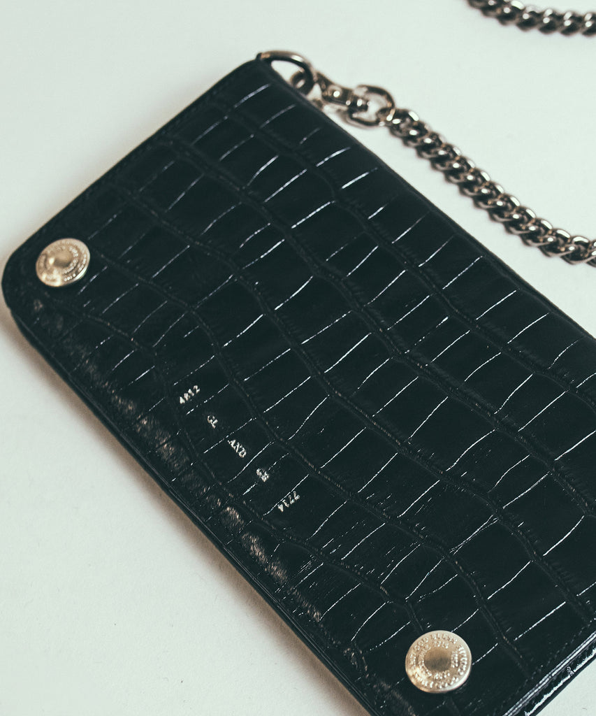 国内の上質なカウレザーにクロコダイルの型押しを施した品のある表情ながらも小ぶりなバイカーウォレットをデザイン。