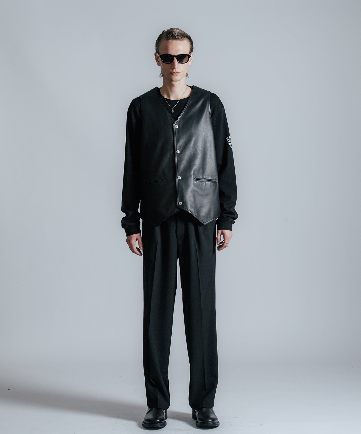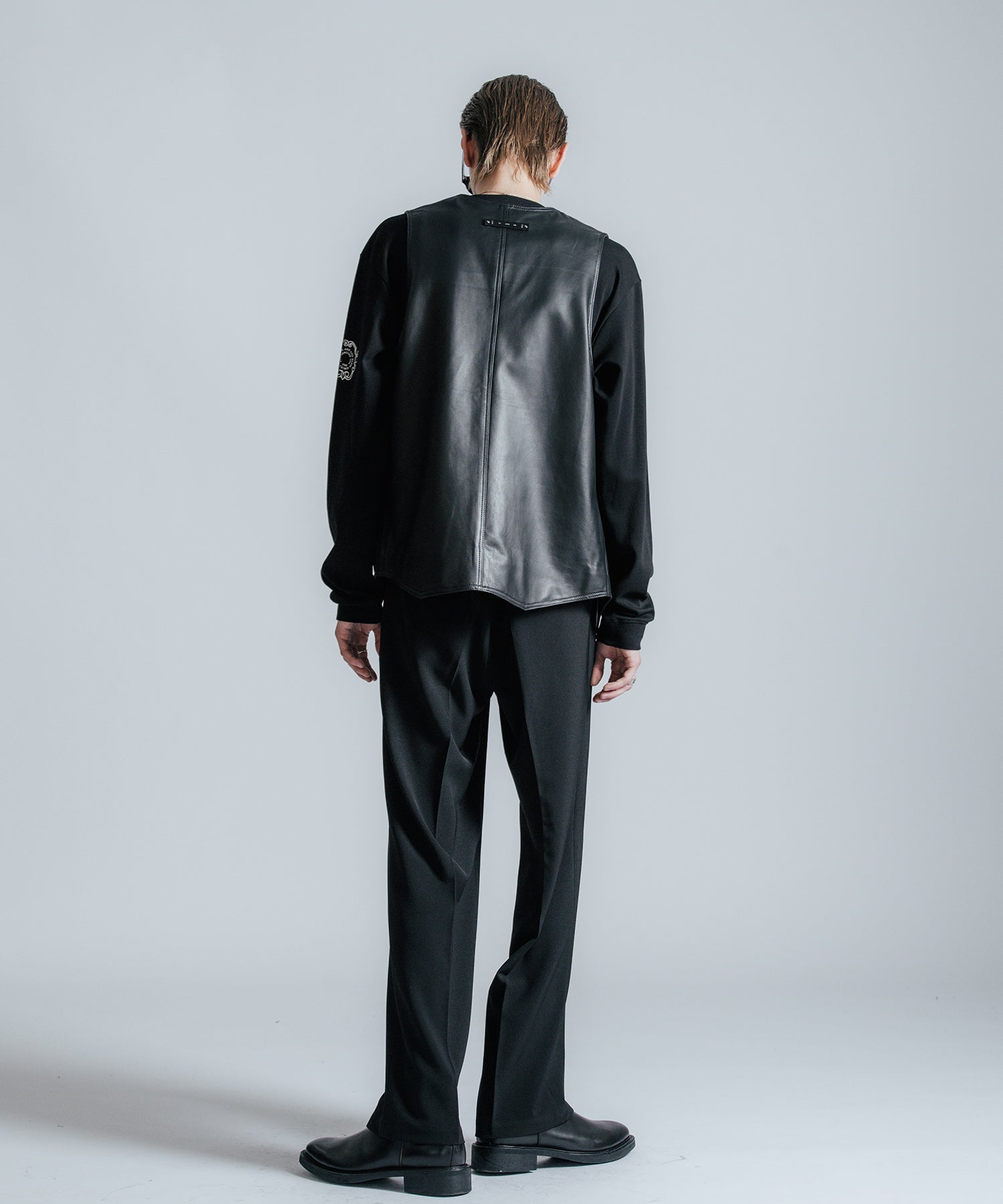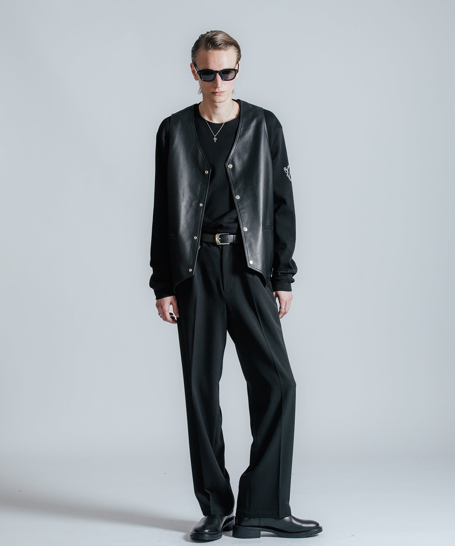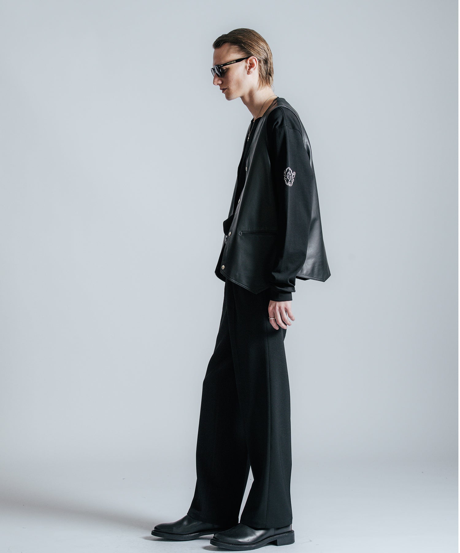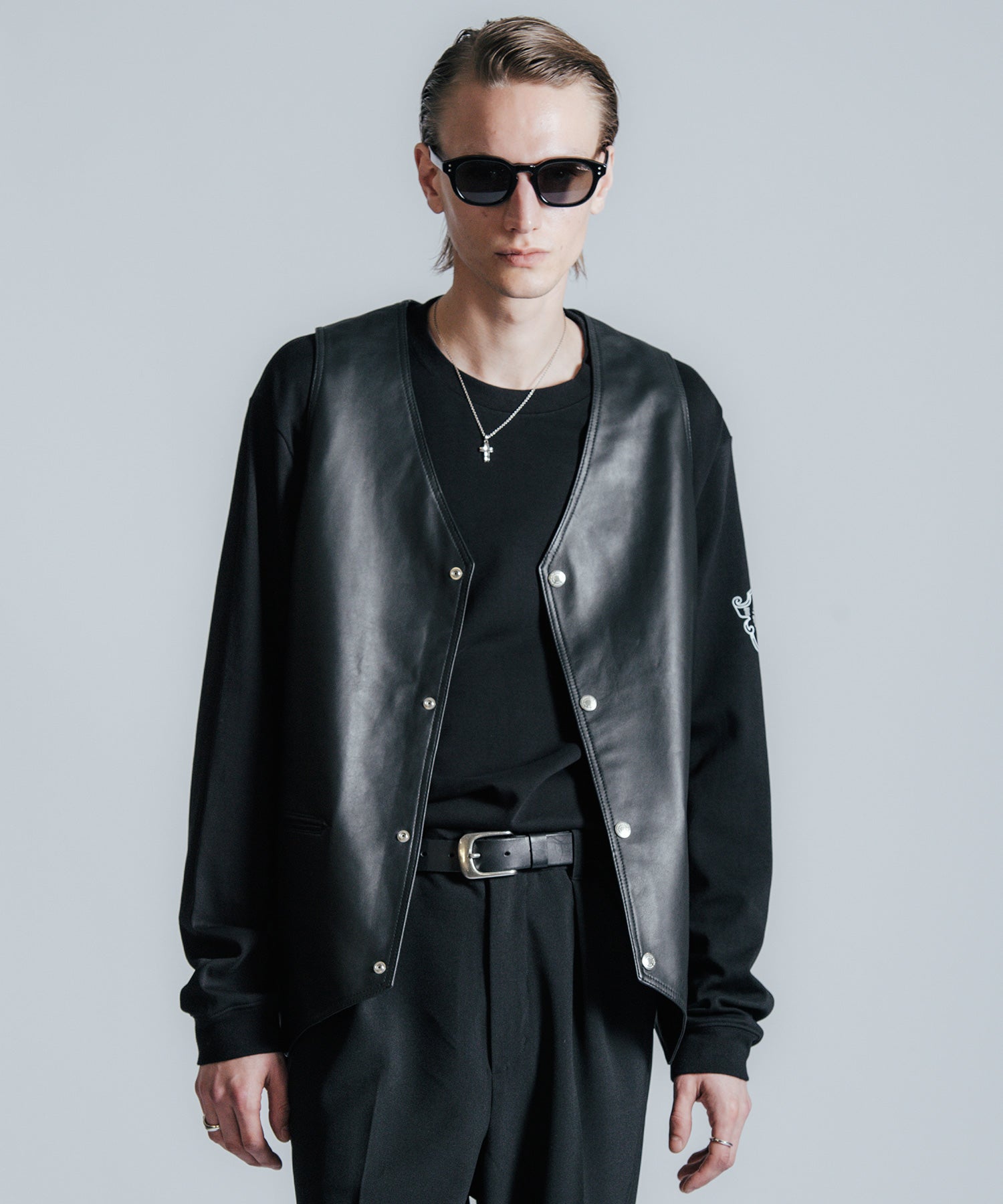 首元にはTHE CRIMIEの哲学を象徴するダイアログロゴ入りのレザーワッペンを配置しています。