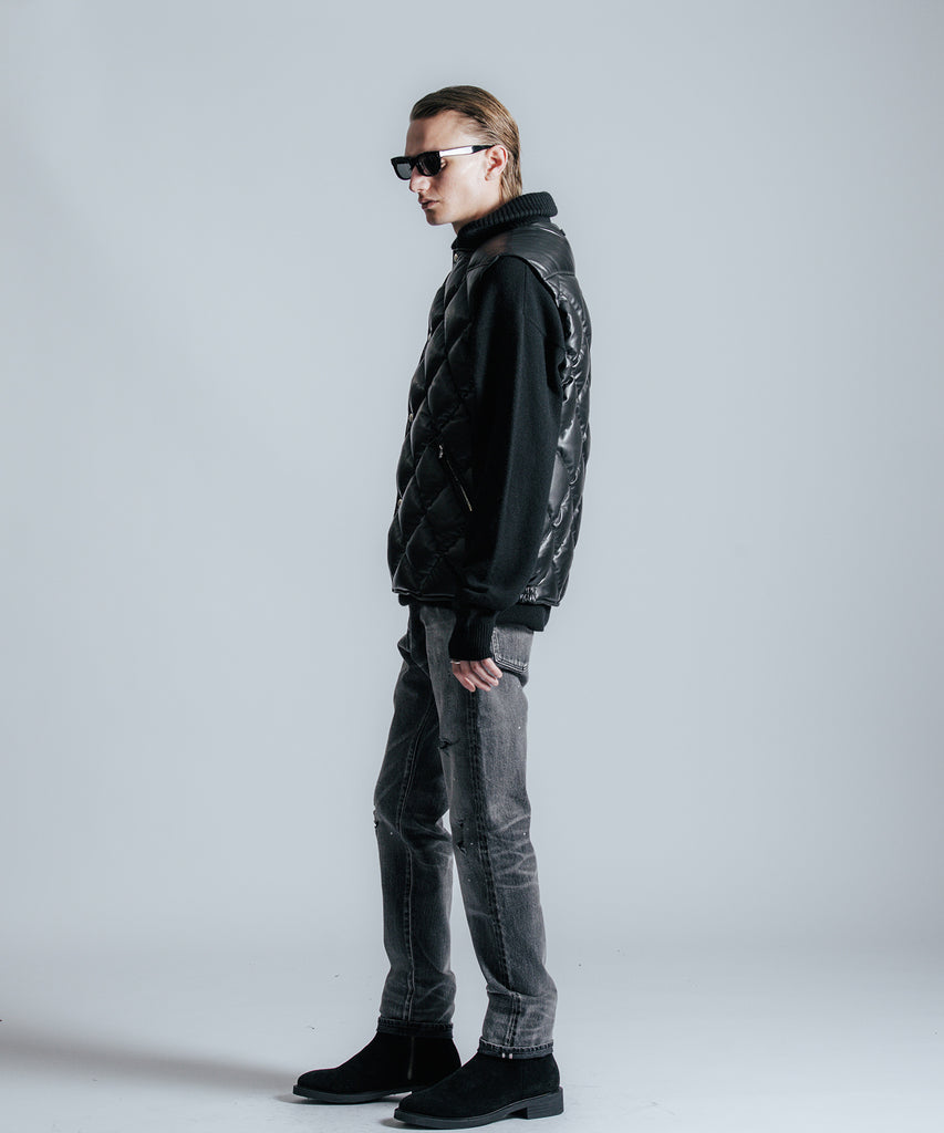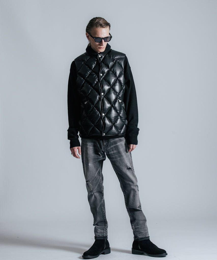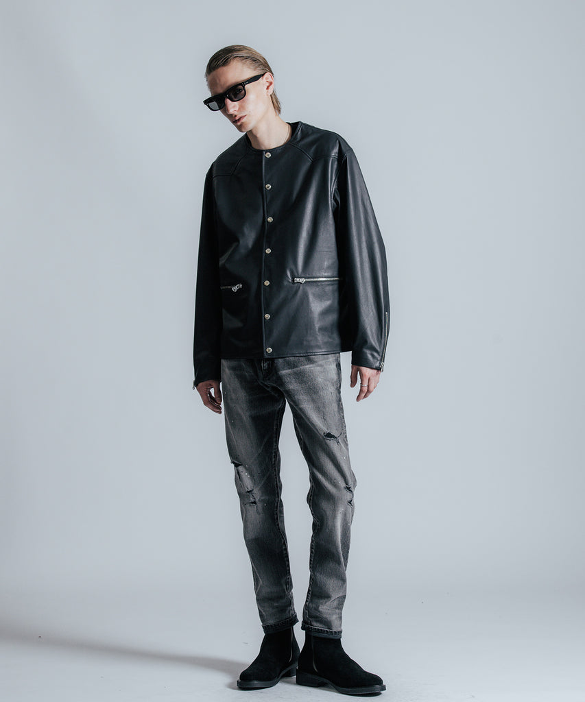 インダストリアルな意匠を持つネームプレートやオリジナルのボタン、ヒップポケットに装飾したダイアログロゴを刻印したレザーワッペンなど、ブランドのスペシャリティーを徹底的に落とし込んだストレッチセルビッチデニムパンツ。