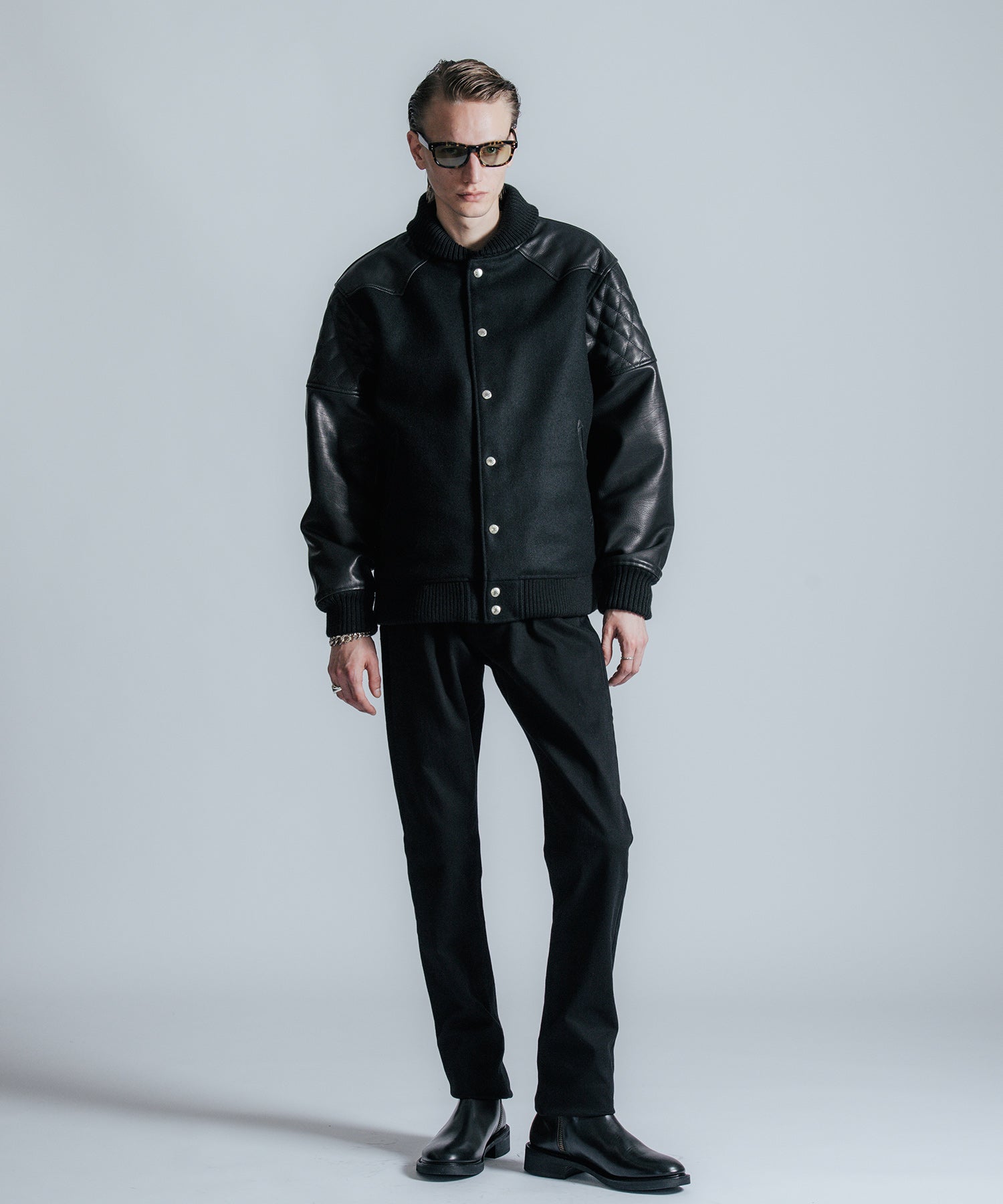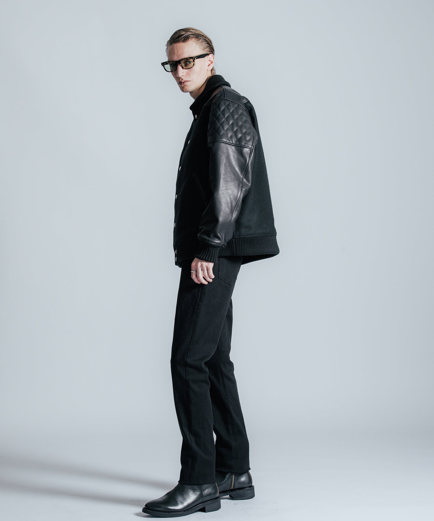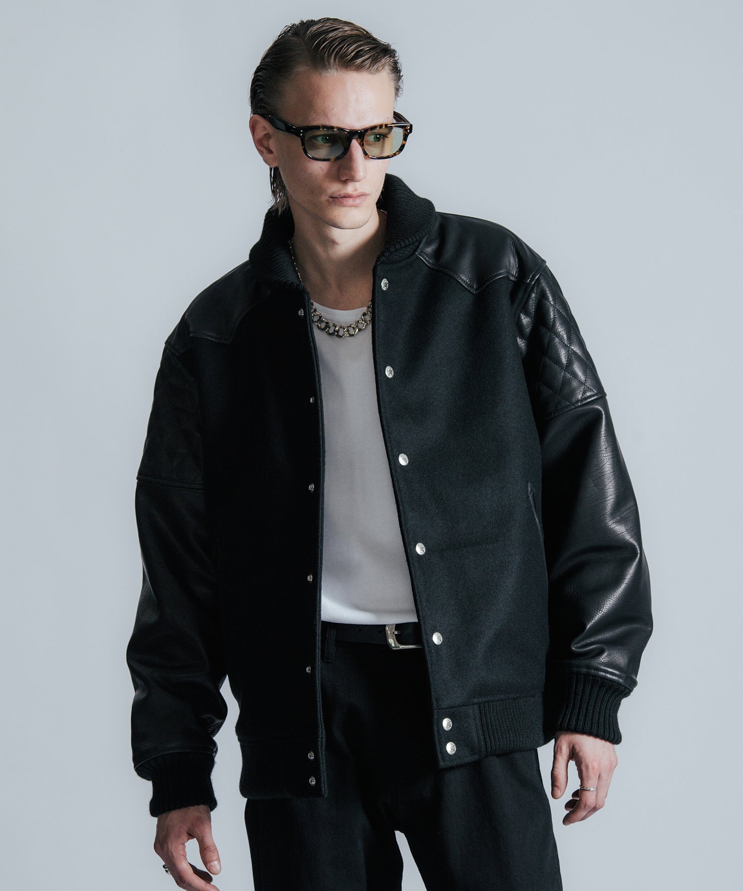 スタジアムジャケットの枠を越えた、THE CRIMIEらしいラグジュアリーな佇まい。 身頃には重厚で上質なウールメルトンを使用し、袖にはブラックレザーをあしらった クラシックかつ現代的な空気をまとうアワードジャケットです。 背面から肩にかけては、ウェスタンシャツに見られるヨーク切り替えと、 ライダースを彷彿とさせるダイヤ柄のレザー切り替えが融合。 アメリカンカルチャーをルーツに持ちながら、都会的で洗練されたデザインへと昇華させました。 首元・袖・裾に配されたリブは、厚みと弾力感を備えたオリジナルの重厚リブ。 身体をしっかり包み込むような防寒性とフィット感を備え、機能性と美意識を両立しています。 ボタンはブランド特注のオリジナルスナップボタンを採用。 そして首元の背面には、レザー製のダイアログロゴワッペンを配置。 “語らずとも伝わる” THE CRIMIEの精神を、静かに背中で語ります。 リアルな素材、機能、デザイン、すべてに意味がある。 この一着が映すのは、気取らずに誇れる、現代のアイデンティティとなっています。